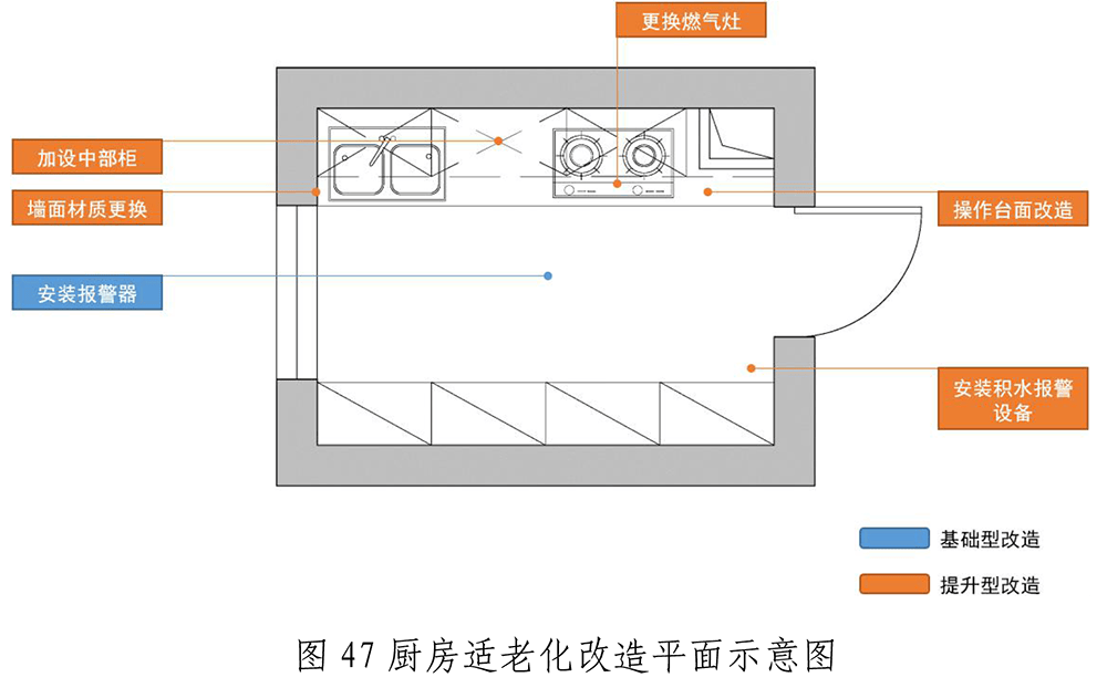 我国老年人口规模巨大。国家统计局数据显示,2022年我国60岁及以上人口约为2.8亿,占全国人口的19.8%。因此,《城市居家适老化改造指导手册》为城市居家适老化改造提供系统、简单、可行的改造方案和技术路径,可有效帮助老年人提高居家适老化改造意识,提升行业居家适老化改造技术水平。《城市居家适老化改造指导手册》中明确指出厨房改造有关燃气安全的两点建议: