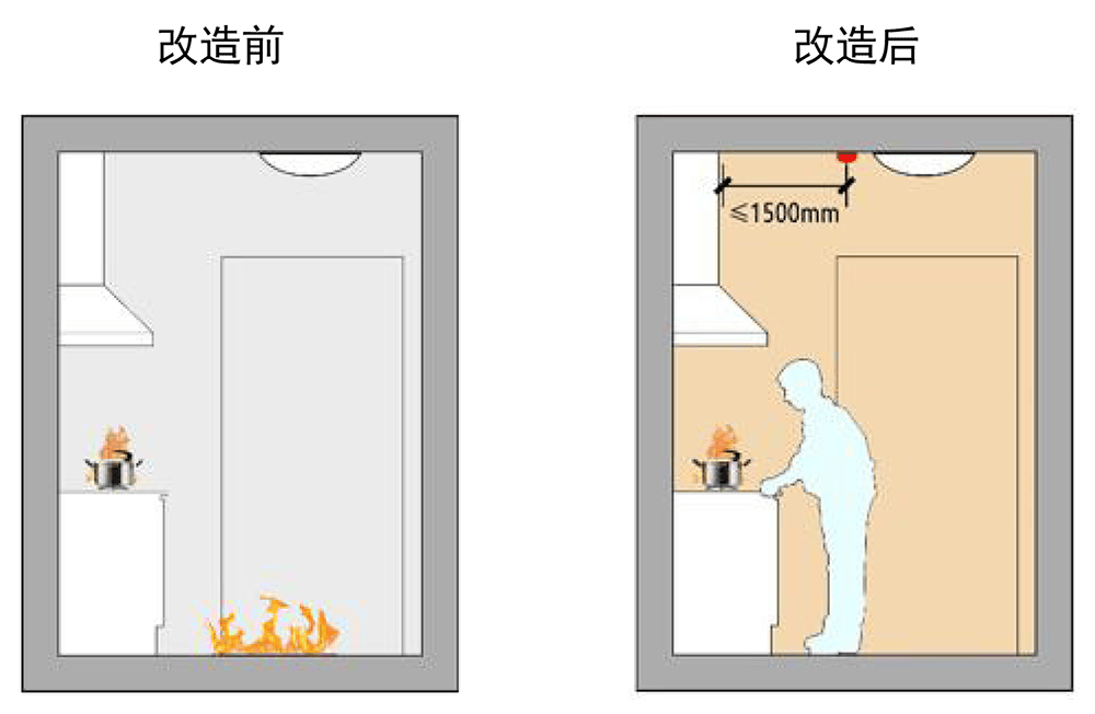 2、在天花板上方设置烟雾报警器,同时安装炉灶自动熄火保护装置。