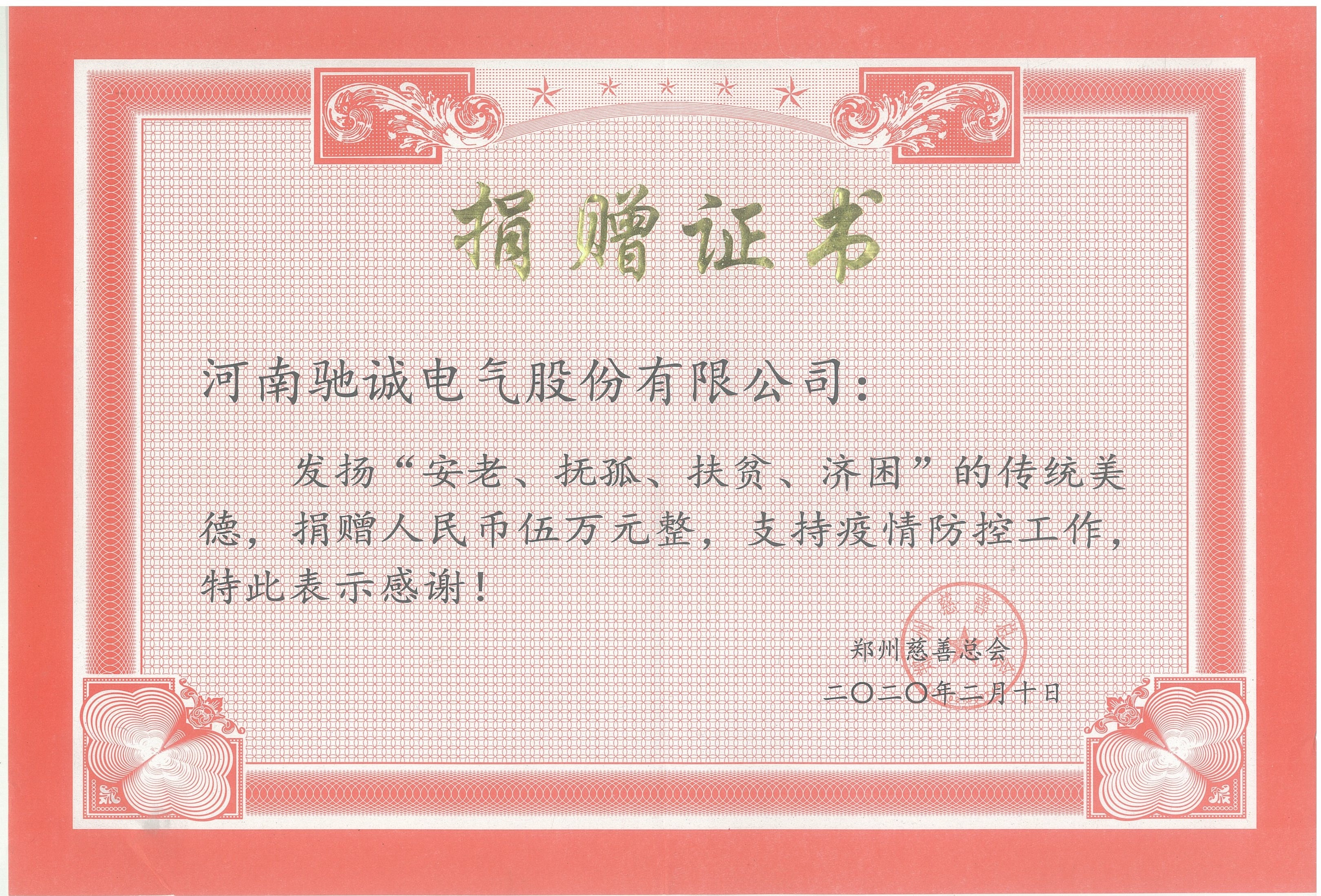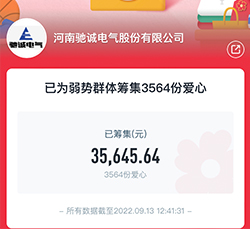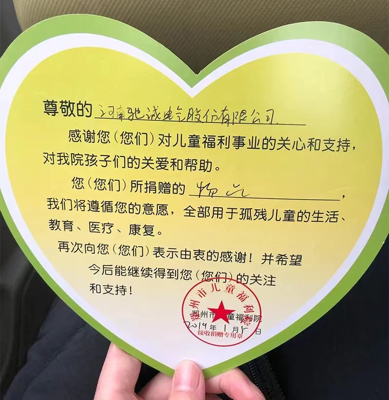 驰诚电气牢记企业责任与社会责任,先后参与了“儿童福利院爱心捐助”、“抗震救灾”、“防疫爱心捐助”、“抗洪救灾”、“爱心助学”等多项公益事业,用自己的涓滴之力,为社会发展做贡献!